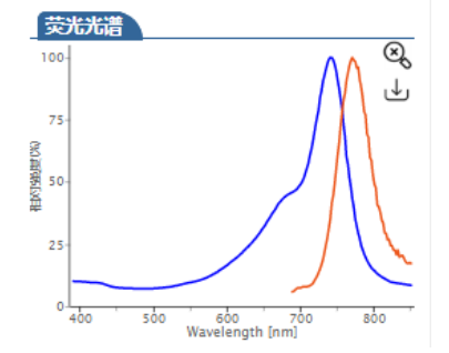 外观专利 :黄绿色气体 CAS号 :1557149-65-1 (近似于) 大分子结构 :C37H47ClN6O 分子式量 :627.26 ex/em :740/770 nm (PBS缓冲器液) 消光数值(ε) :199000 L⋅mol−1⋅cm−1 量子成品率(Φ) :0.3 溶解度性 :可不溶氯仿,甲醇,乙腈,DMF等生产稀释剂,微不溶水 存储状态 :遮光,吹干,-20oC存储 运输管理因素 :温度 商品描素 Cy7 (Cyanine 7) 有的是种近红外花青素荧光染剂。主要是因为它的荧光激发光谱(Em:770nm)碰巧出于肌体组织开展结构近红外机会 I 的范围(肌体的外周血,体液和组织开展结构此范围情况荧光弱,而长激发光谱穿透力性强),所有Cy7无时无刻用于小哺乳爬行动物活体身体里影像中。Cy7荧光人眼不容见,并体视显微镜观察查看时候需要要近红外滤片,许多 荧光体视显微镜观察(包涵共对焦体视显微镜观察)并不具备,只是普鲁士蓝染色细胞膜仪(flow cytometry)无时无刻具备Cy7滤片组。Cy7是常用荧光染剂,Cy7可拿来记号核酸,核蛋白,抗体阳性,多肽,纳米技术粒等,它是*常用的小哺乳爬行动物定影剂最为。 本产品设备Cy7荧光基(fluorophore)是调整后的构造,三次甲基桥链(polymethine)经环己烯凝固,荧光量子产出率上升了20%,才能使荧光更亮。 叠氮(azide)是可用怪物标识基团。达到选择率电学不起作用(click chemistry),叠氮应该和一型号炔烃(alkyne)或环炔烃(strained alkyne)生产稳定性的怪物外链(bioconjugate)。选择率电学不起作用有效率很高,可在水相中(也有无机相)怏速一定量达到,如果在低氨水浓度(μM)和低温制冷的效果(4oC)下也可达到。选择率电学不起作用技术水平發展很完善,各方面各样的相关免疫试剂房地产业能得,各方面各样的怪物标识app多方面。Cy7记号后的物质Ex/Em是740/770nm。和它兼具相类似荧光基本特性的染剂收录Alexa Fluor 750,DyLight 755等。