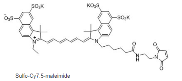 sulfo-Cy7.5 maleimide;水可溶花青素Cy7.5-马来酰亚胺;Sulfo-Cy7.5 maleimide看:环保固态垃圾CAS号:n/a化学结构式式:C49H49K3N4O15S4分子式量:1179.49ex/em:788/808 nm (PBS响应液)消光公式(ε):223000 L⋅mol−1⋅cm−1量子产出率(Φ):融解性:可溶解于甲醇,DMF等有机会相转移催化剂,很容易溶解于水包存前提条件:阴凉,干燥的,-20oC包存运输管理环境:室内温度