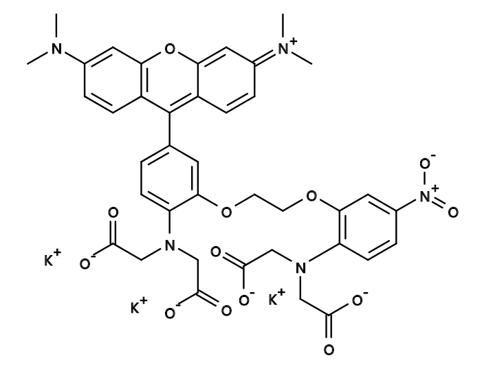 生物科技有限公司生产销售“Rhod-5N, tripotassium salt|钙离子荧光探针Rhod-5N, 三钾盐”“分子量:900.02,激发(nm):557,发射(nm):580,Rhod-5N对Ca2 +的结合亲和力较低(Kd =〜320 µM),适用于10 µM至1 mM的Ca2 +测量。”,该产品仅用于科研,如果需要请联系我们