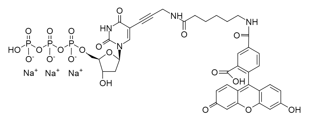 生物科技有限公司生产销售“Fluorescein-12-dUTP (Perkin-Elmer)|1 mM in Tris Buffer (pH 7.5)|荧光素12修饰的脱氧尿苷5'-三磷酸酯(Perkin-Elmer)”“分子量:1058.61,激发(nm):498,发射(nm):517,吸光度(nm): 487,染料修饰的脱氧尿苷5'-三磷酸酯(例如氨基烯丙基-dUTP)可用于通过常规酶促掺入方法(例如逆转录,缺口翻译,随机引物标记或PCR)生产含染料的DNA。”,该产品仅用于科研,如果需要请联系我们