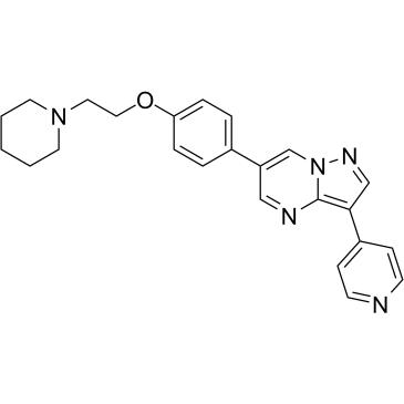 碳原子式:C24H25N5O, 碳原子量:399.4882, 色度: > 98%, 融解性: (R.T.: 25℃): DMSO, Dorsomorphin (BML-275; Compound C) 不是种选性,細胞光泽感性的,ATP 行业性的 AMPK **剂 (在并没有 AMP 的的情况下,Ki 为 109 nM)。Dorsomorphin (BML-275) 选性** BMP I 型多巴胺受体 ALK2,ALK3 和 ALK6。