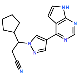 大碳原子结构:C17H18N6, 大碳原子量:306.36502, 色度: > 98%, 分解性: (R.T.: 25℃): DMSO, Ruxolitinib (INCB018424) is the first potent, selective, JAK1/2 inhibitor to enter the clinic with IC50 of 3.3 nM/2.8 nM in cell-free assays, >130-fold selectivity for JAK1/2 versus JAK3.