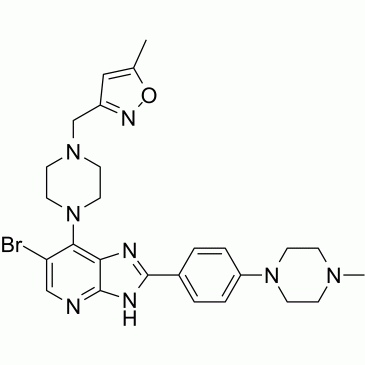 化学结构式式:C26H31BrN8O,化学结构式量:551.48,含量: > 98%,熔化分解性: (R.T.: 25℃): DMSO,CCT 137690是激酶 (aurora) 注射剂,激酶A,B,C的 IC50 值各是为15,25 和19 nM。